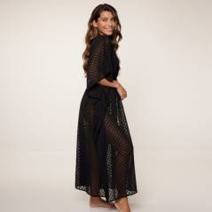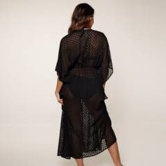 Piękna długa narzutka w geometryczny wzór. Obwód na gumce dzięki czemu pięknie się układa, wiązana na sznureczki ozdobionymi chwostami.